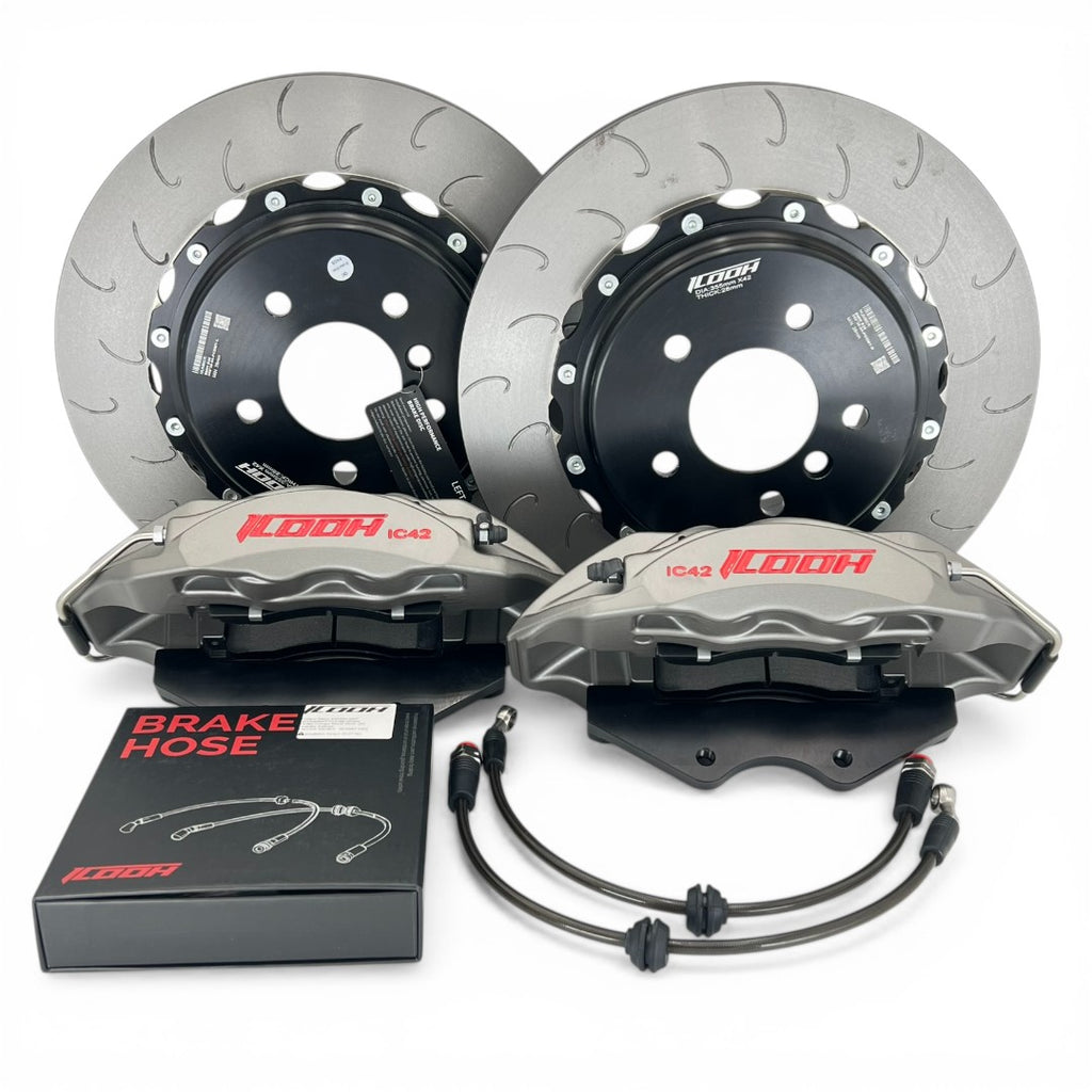 The 4-piston IC42 model caliper is a single piece forged monobloc design.