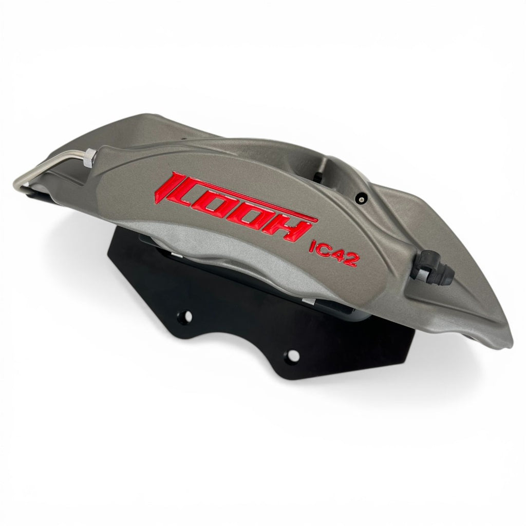 The 4-piston IC42 model caliper is a single piece forged monobloc design.